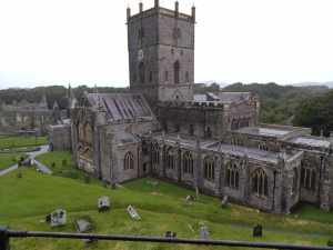 It was forecast to rain, and rain it did. After breakfast, we set off to visit St David’s, the smallest city in Britain and a place of pilgrimage for centuries. Being just after the Bank Holiday and on a very wet Tuesday, we didn’t expect many other tourists, and we were right. Driving through this city, more akin to a large village, we encountered little traffic and were one of only two cars in the car park servicing its Cathedral dedicated to my namesake, Saint David.