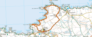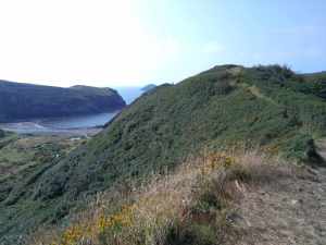 We tarried here awhile, resting our tired limbs in the sunshine and watching tourists risking the sharp rocks on the small beach at the end of the harbour slipway. The buildings, though ruined, are still very impressive and give the false impression of military origins. We had a little difficulty finding our intended trail, but after much consideration of my GPS, we eventually located it and headed towards Trefin.