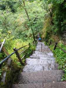 Parking was a challenge in the small lot next to the kiosk selling tickets for the forty-five-minute trail to the waterfalls. After a ten-minute wait, a car left, and we took its spot. By the time we paid the £4 entrance fee each, the rain had thankfully stopped. We had underestimated the terrain’s difficulty. After the first section, which led to the edge of a precipice offering a view of the waterfall and the remainder of the trail plunging down the cliff, Sue wisely chose to return to the car, only seven weeks post-operation; this was a challenge too far. I pressed on and was rewarded with spectacular views of the falls and the surrounding mountainside. The footing was tricky thanks to the earlier rain, but the effort was well worth it.