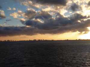 As expected, our body clocks woke us around 5 am, though we valiantly resisted the urge to get up for at least another hour. It was still dark outside, but from our window we spotted the twinkling lights of a large cruise ship gliding silently into the nearby port, our home for the next leg of the journey.