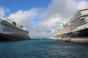 When we checked the ship’s cameras on our cabin TV before heading to breakfast, we could see that we were still at sea, though Nassau, the capital of the Bahamas, was already visible on the horizon. By the time we’d finished our morning meal, we had smoothly docked alongside a Disney cruise ship.
