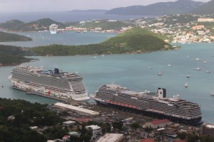 The Nieuw Statendam glided into her berth at Charlotte Amalie, St. Thomas, one of the Virgin Islands in the Caribbean Sea and a constituent district of the United States Virgin Islands, an unincorporated territory of the United States. By the time we had breakfast, we could see a light rain shower through the restaurant windows, somewhat disappointing.