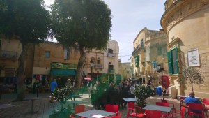 We were given a couple of hours to explore the city, and after visiting an ATM to acquire the Euros needed to pay the ferry company, we set off. Making our way from the bus terminus, we found Independence Square, also known as It-Tokk, which is located in the heart of Victoria. Today, it serves as a central meeting point for both locals and visitors. Once the site of the island’s main marketplace, it is now lined with charming cafés, restaurants, and shops. One of the square’s most prominent landmarks is the Banca Giuratale, a grand baroque-style building that once served as the seat of Gozo’s local government. The very ancient narrow streets surrounding the square were thoroughly explored and photographed before we moved further up the hill to the Citadel of Gozo (Il-Kastell), a historic fortress that dominates the skyline of Victoria. Perched on the hilltop, the Citadel has served as a defensive stronghold for centuries, offering breathtaking panoramic views of the island. We entered the fortress via Cathedral Square, meandering through the many ramparts to reach its highest point, where we admired the panorama and took our photos.  Retracing our steps to the bus terminus, we stopped briefly at a pharmacist for Jim H to buy some sea-sickness tablets (he had been affected by the sea journey) and then again for slices of pizza, eaten in a small park, followed by ice cream from a nearby gelateria.