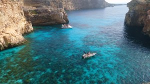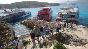 It was just a short hop across the water to the small, picturesque island of Comino, situated between Malta and Gozo. Covering just 3.5 square kilometres, it is renowned for its crystal-clear waters and rugged coastline. With no cars and only a handful of residents, it is ideal for swimming, snorkelling, and hiking. The most famous spot on Comino, known for its turquoise waters and white sand seabed, is the Blue Lagoon. Disembarking, we climbed our way to a string of food and drink outlets where we purchased drinks and sat watching the antics of our fellow tourists and the many small boats arriving to disgorge their human contents into the growing melee. Roy chose to go for a swim from the tiny beach, while some of us opted to explore the island on foot. Jim C and I, later joined by Jim H, trekked to the cliffs above the Blue Lagoon and watched, fascinated, as the tourist boats chugged their way around the small lagoon.