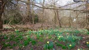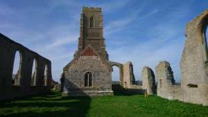 Passing alongside ancient woodland bedecked with daffodils, we came across the tiny hamlet of Covehithe and the ruined church of St Andrew’s. Once a glorious medieval church, St Andrew’s now lies in picturesque ruin by the sea, with only the lofty fourteenth-century tower (preserved as a sea mark) and a curtain of original walling surviving. It dwarfs a tiny 17th-century church, built against the tower within the shell of the larger structure, with an unusually thatched roof. We spent some time exploring inside the church and the ruins outside, along with its small adjacent cemetery.