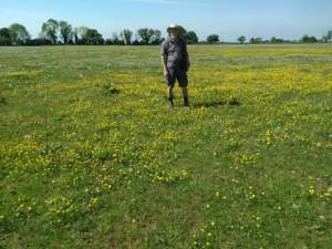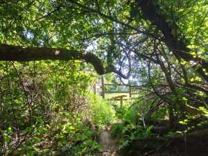 We had already walked part of the route during yesterday’s ramble and expected a well-trodden path, not one that required boots or long trousers, so, mistakenly, I opted for shorts and sandals. We decided to tackle the route in reverse. At first, all went well, but upon reaching the end of a wooded section where a gate opened into a grassy field, a boggy stream cut across the path, making further progress impossible without proper footwear.