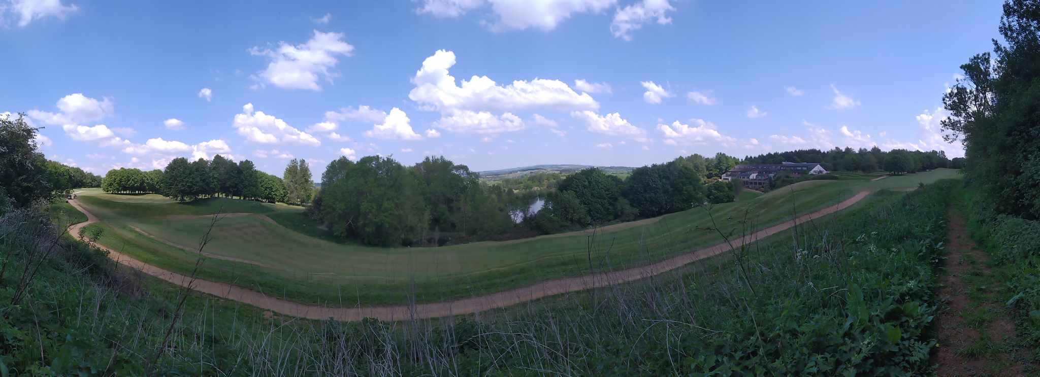 Doubling back into the woods, we forged our own route along a slope which led us onto the golf course, where we were able to rejoin the trail. The going remained easy until we reached the far side of the course, where the path led through another wooded area—this time, along a narrow, overgrown trail thick with brambles and nettles. In shorts, it was set to be a painful affair. After about 50 metres, we again turned back and instead plotted a route across the manicured fairways of the course.