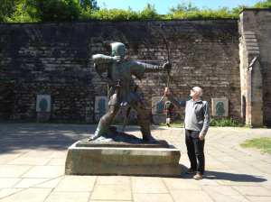 Consulting Google Maps, we made our way across the city to the castle’s lofty position overlooking Nottingham. Originally built in 1068 on the site of a Norman stronghold, the castle was expanded through the medieval period and became both a key royal fortress and occasional royal residence. After paying the entrance fee, we began with the Robin Hood exhibition, dedicated to Nottingham’s most beloved outlaw. Over the centuries, Robin Hood’s legend has evolved into one of popular culture’s best-loved folk tales, retold in everything from medieval ballads to Hollywood blockbusters. The exhibition included interactive displays and a high-tech video presentation, pure hokum, but great fun nonetheless. Sue especially enjoyed trying her hand at archery.
